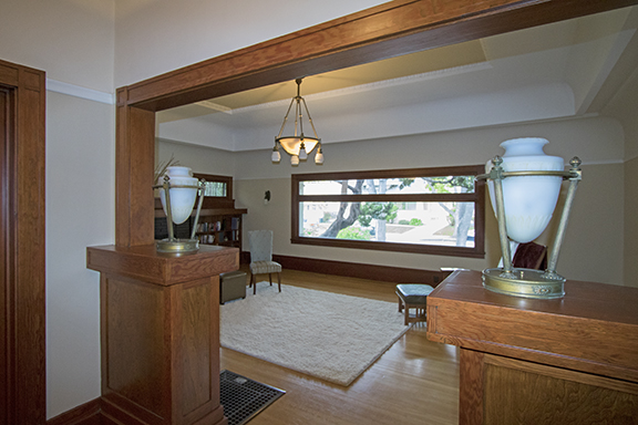Gorgeous Wolfe Prairie home in the Naglee Park neighborhood of San Jose. Built in 1914 for Lewis Baker, owner of a major electrical lighting business, the house has excellent examples of Wolfe features such as a huge living room window, elaborate coved ceiling with egg-and-dart molding, and wood paneling and plate rails throughout the house. Reflecting its original owner, it contains beautiful original light fixtures.